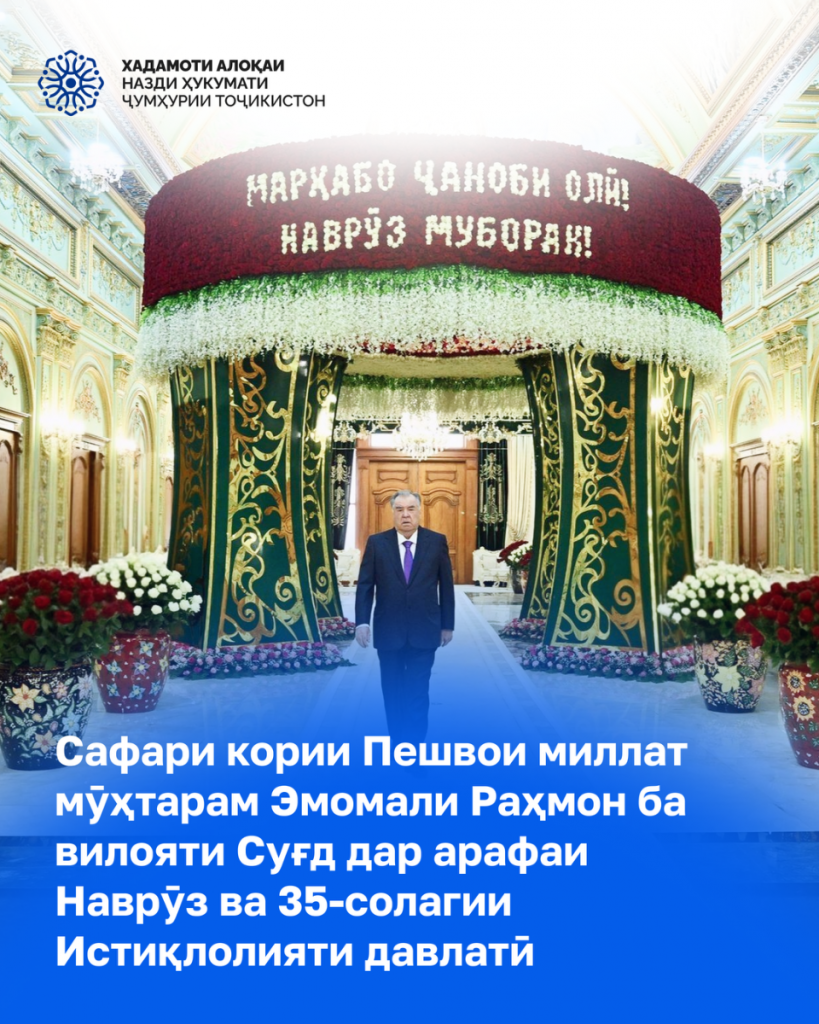 9 март Президенти Ҷумҳурии Тоҷикистон, Пешвои миллат муҳтарам Эмомалӣ Раҳмон бо мақсади шиносоӣ бо вазъи зиндагии мардум, ифтитоҳи як қатор иншооти таъйиноти гуногун ба истиқболи ҷашни Наврӯзи байналмилалӣ ва таҷлили 35-солагии Истиқлоли давлатӣ ба вилояти Суғд ташриф оварданд.
